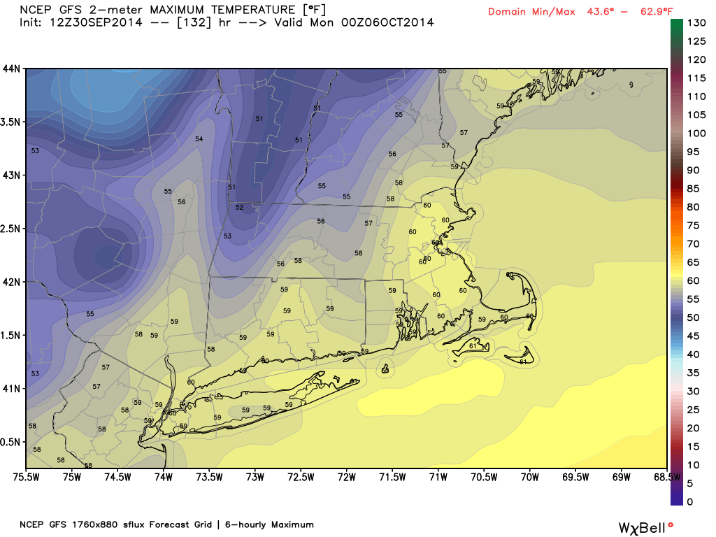 The picture above is a high temperature forecast from one computer model for Sunday afternoon. Remember that strong cold front I talked about in the paragraph above? Yes, last Sunday it was shorts and t-shirt weather. This Sunday, temps struggle out of the 50’s. Get the apple cider ready! Welcome to fall.